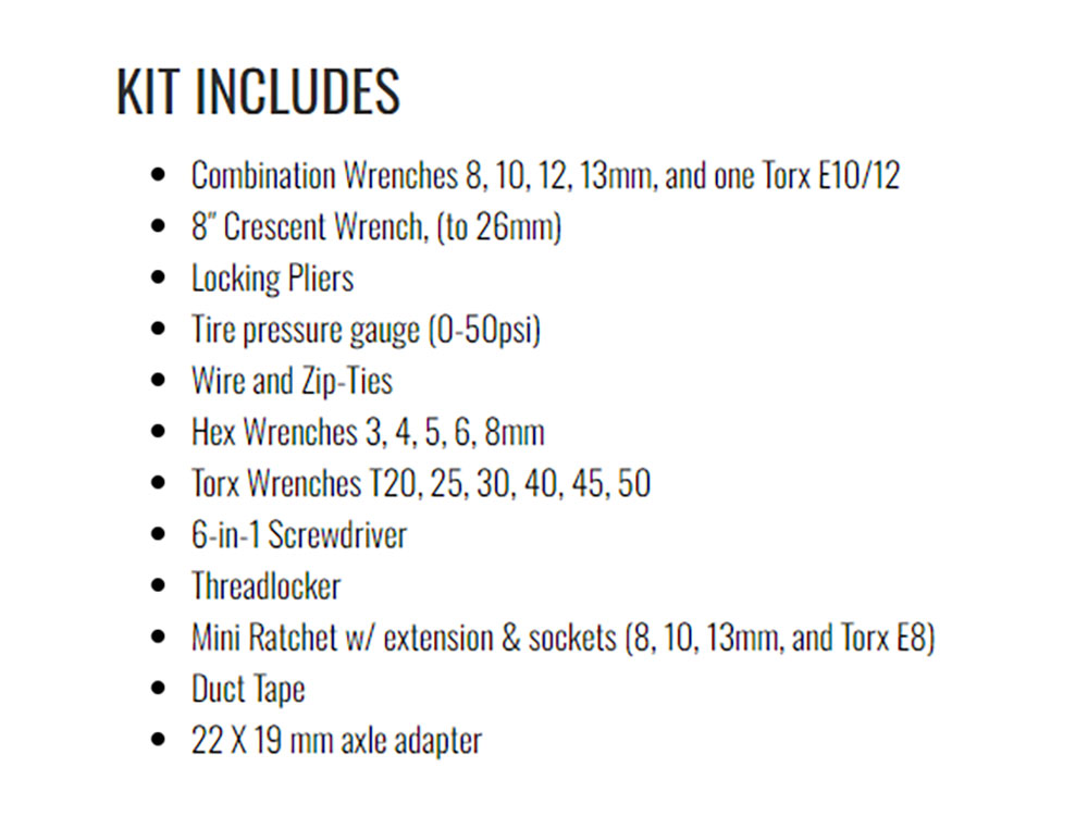 The perfect tool kit for 2018 and older BMW motorcycles. Designed for road-side repairs and adjustments. Includes 6 torx keys, 5 hex keys, 4 metric wrenches, a mini ratchet with 2in. extension, 4 sockets and a 19x22mm axle adapter. The kit is rounded out with a 6-in-1 screwdriver, locking pliers, adjustable wrench, cable ties, mechanics wire, duct tape, thread locker, and a tire gauge. The tools stay organized in a heavy-duty roll-up pouch.